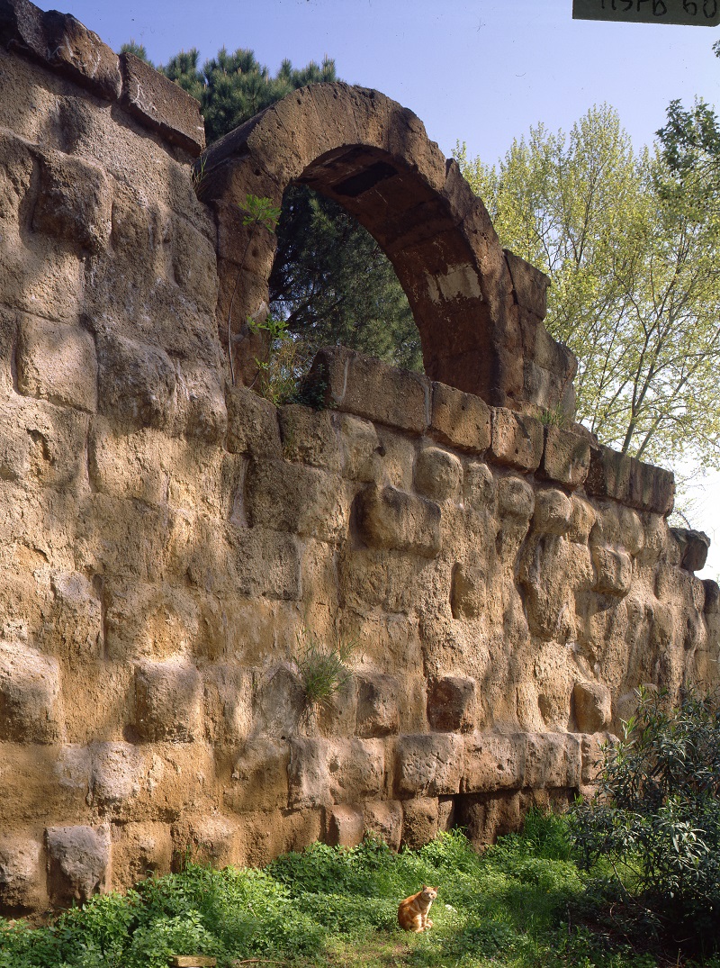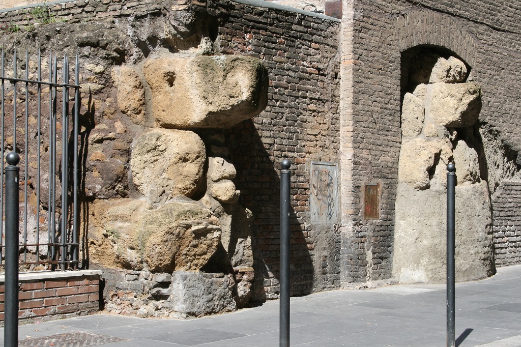 Resti di murature in grandi blocchi di tufo giallo, in alcuni casi poco visibili, in altri imponenti, costituiscono oggi la sola testimonianza della cinta muraria nota come Mura Serviane. Del più antico recinto, databile effettivamente al VI secolo a. C. e attribuito all’iniziativa del re Servio Tullio, si conservano alcuni avanzi in blocchi più piccoli di tufo granulare grigio. La gran parte di quanto si conserva delle mura va in realtà assegnata alla ricostruzione effettuata agli inizi del IV secolo a.C., poco dopo il grande saccheggio di Roma ad opera dei Galli nel 390 a.C. Questa datazione, oltre che dalle fonti letterarie, è confermata proprio dall’utilizzo di un particolare tipo di tufo, detto “tufo giallo di Grotta Oscura”, le cui cave si trovavano nel territorio di influenza della città etrusca di Veio; l’impiego massiccio a Roma di questo tipo di tufo si deve quindi datare successivamente alla conquista della città avvenuta nel 396 a.C.