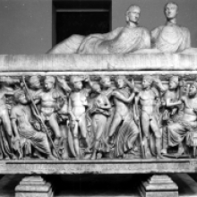 I personaggi raffigurati sul sarcofago, ivi rinvenuto secondo l'umanista cinquecentesco Flaminio Vacca ed ora ai Musei Capitolini, sono stati identificati con l'imperatore Alessandro Severo e di sua madre Giulia Mamea.
