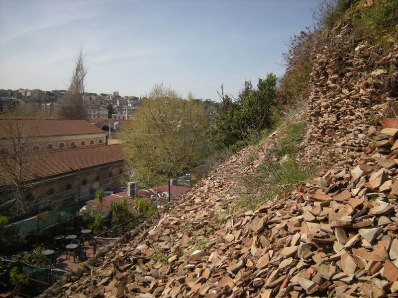 Un accumulo di tale entità ed altezza fu reso possibile dalla presenza di una prima rampa e di due stradelle percorse dai carri ricolmi di cocci e di anfore frammentarie, molte delle quali conservano il marchio di fabbrica impresso su una delle anse, mentre altre presentano i tituli picti, note scritte a pennello o a calamo con il nome dell'esportatore, indicazioni sul contenuto, i controlli eseguiti durante il viaggio, la data consolare.